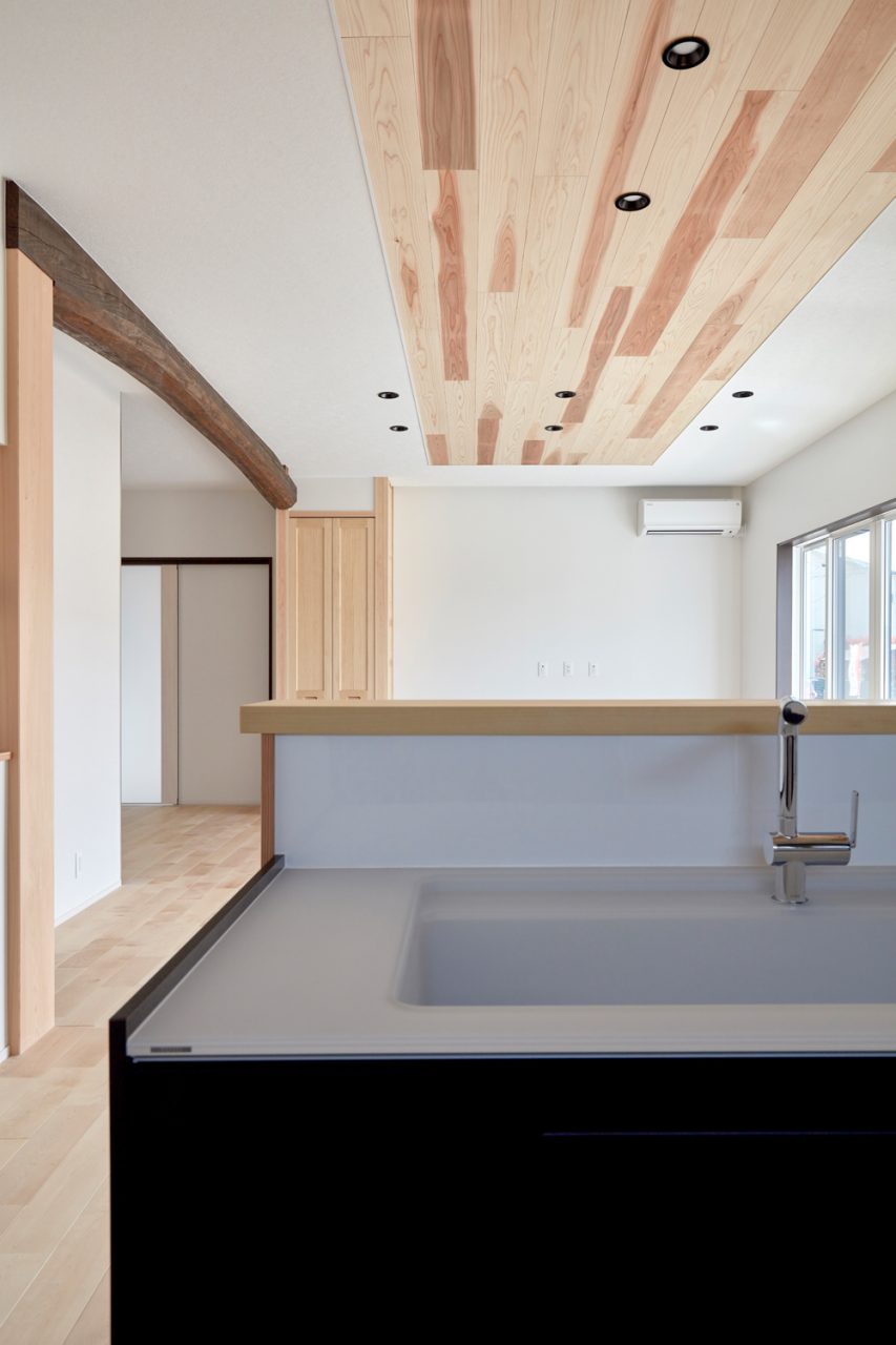 料理をしているときも、リビングとの一体感を感じることができるアイランド風キッチンが特徴のH様邸。両サイドから出入りできるため、作業動線が良いところも嬉しいポイント。